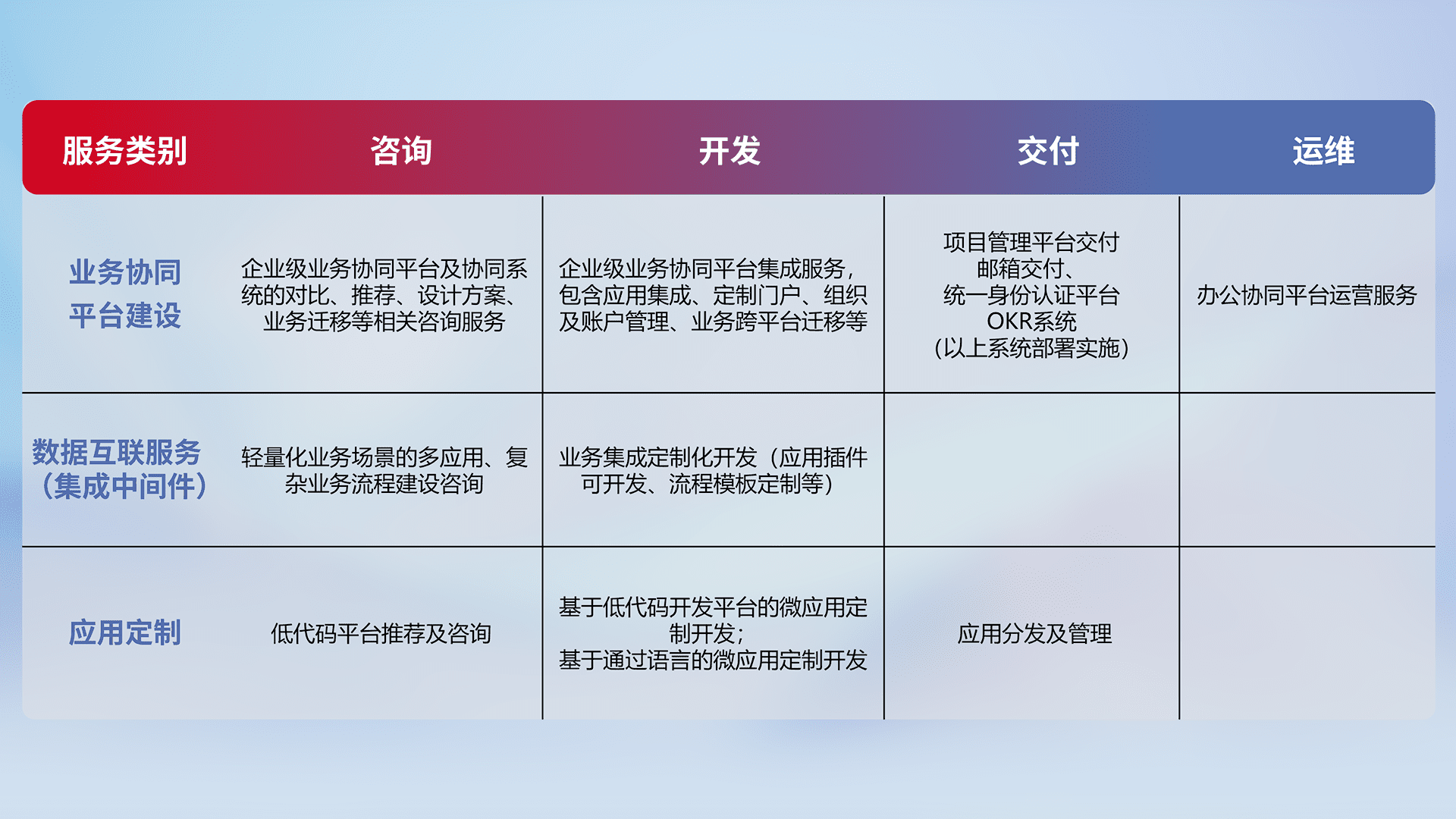 针对钉钉、、、企微、、IDaas等平台级产品提供产品的规划、、、方案、、、交付、、、、定制化开发等服务,,,实现如统一协同办公、、、智能客户服务、、、混合会议管理、、、智能数据查询、、、、等业务场景,,,实现数字化转型。。