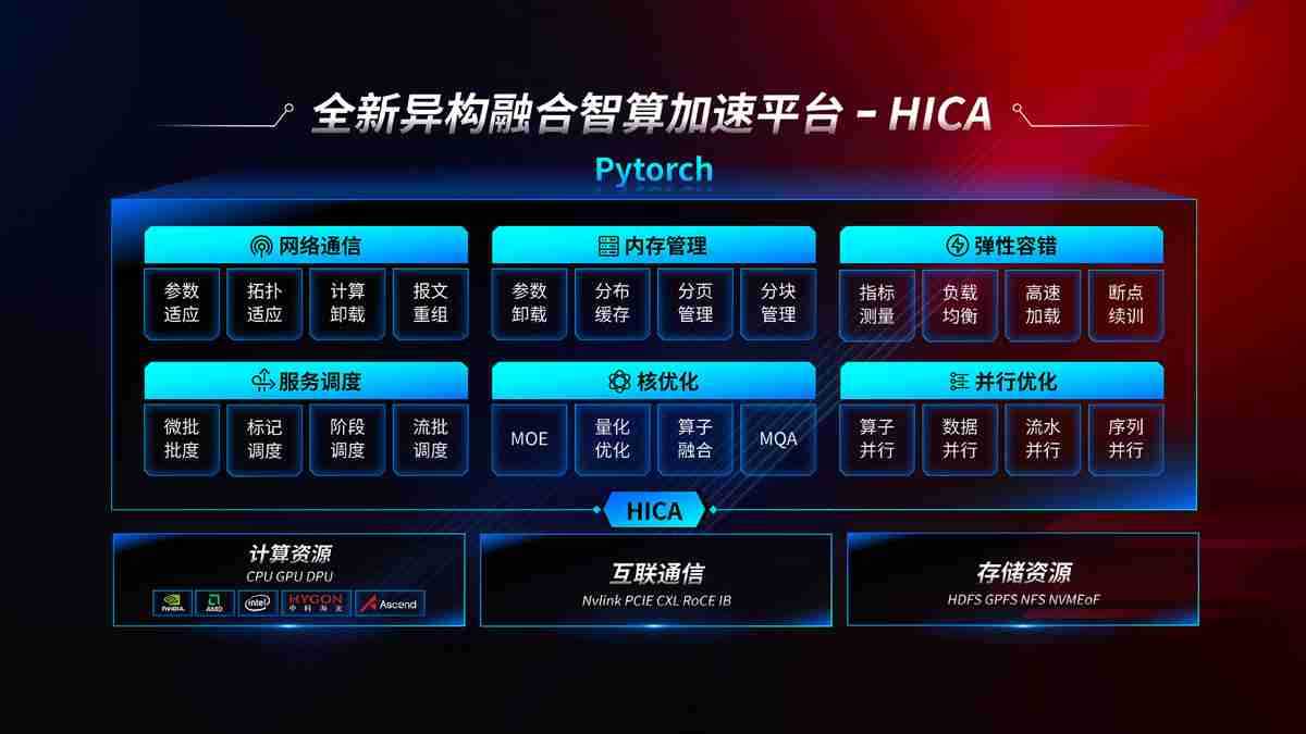 通过自研的服务层、、、、中间适配层、、以及调度编排算法,,,,采用数据并行、、、模型并行等多种并行方式,,,,把并行计算任务进行有效的分解,,,使其分别由相应的软件栈和算力资源来承接。。。当GPU资源变化,,,,HICA可以实时动态调度计算子任务并调整模型拓扑和架构,,以充分聚合各种算力资源。。